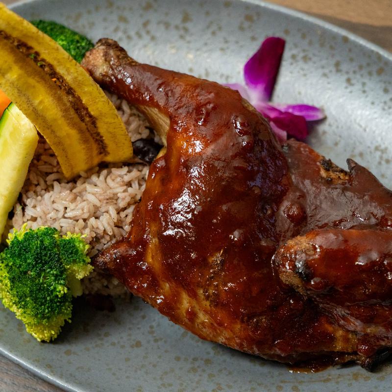 Jerk-spiced marinated half chicken smothered in our signature house jerk or island BBQ sauce.
