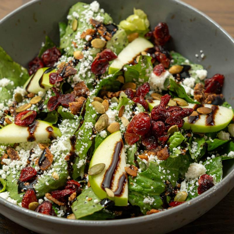 Greatest of all time! Romaine lettuce tossed in our Signature Poppyseed dressing, apples, dried cranberries, goat cheese crumbles, toasted pepitas, and cherrywood smoked bacon with our Signature Balsamic Glaze.
